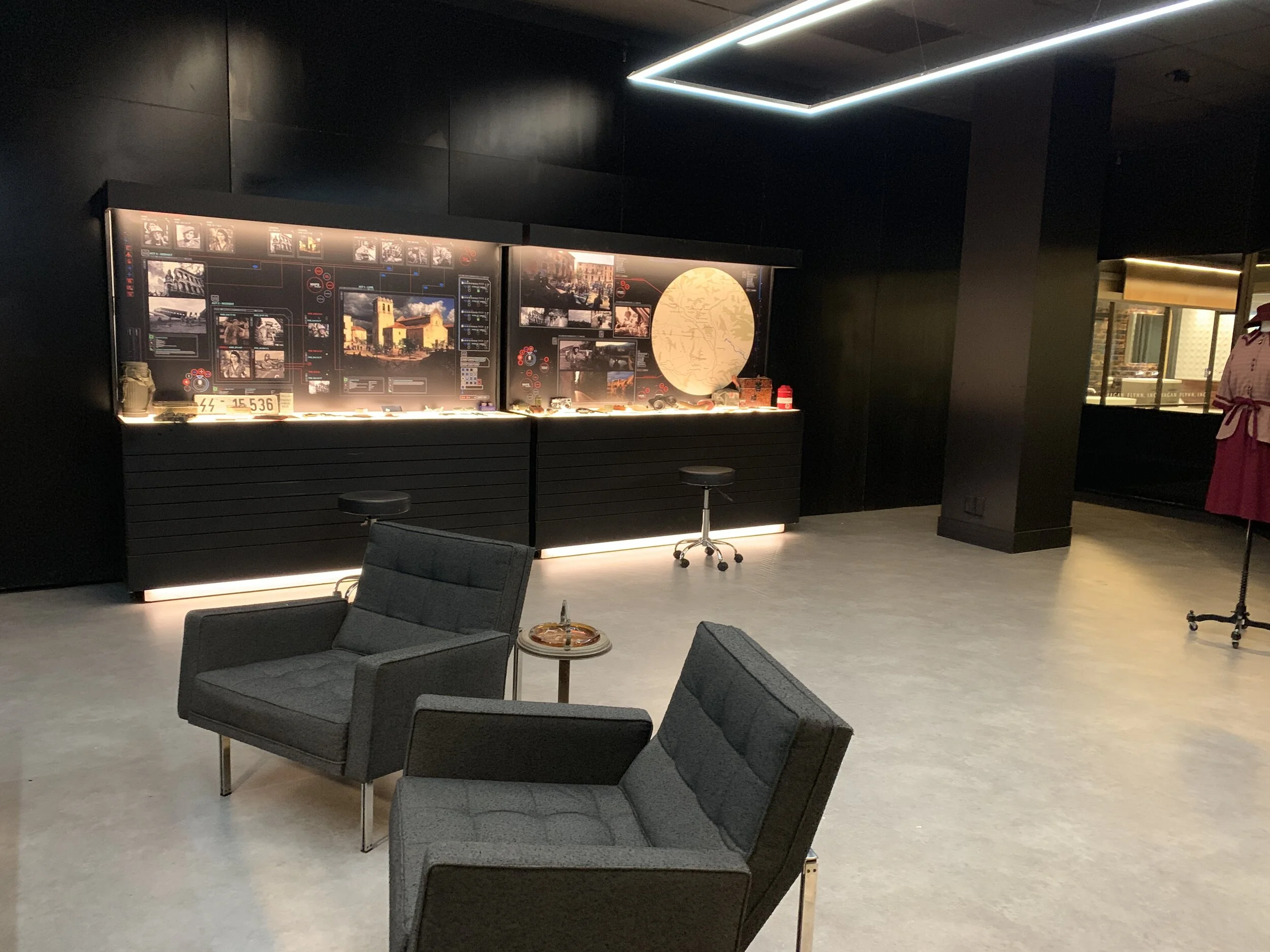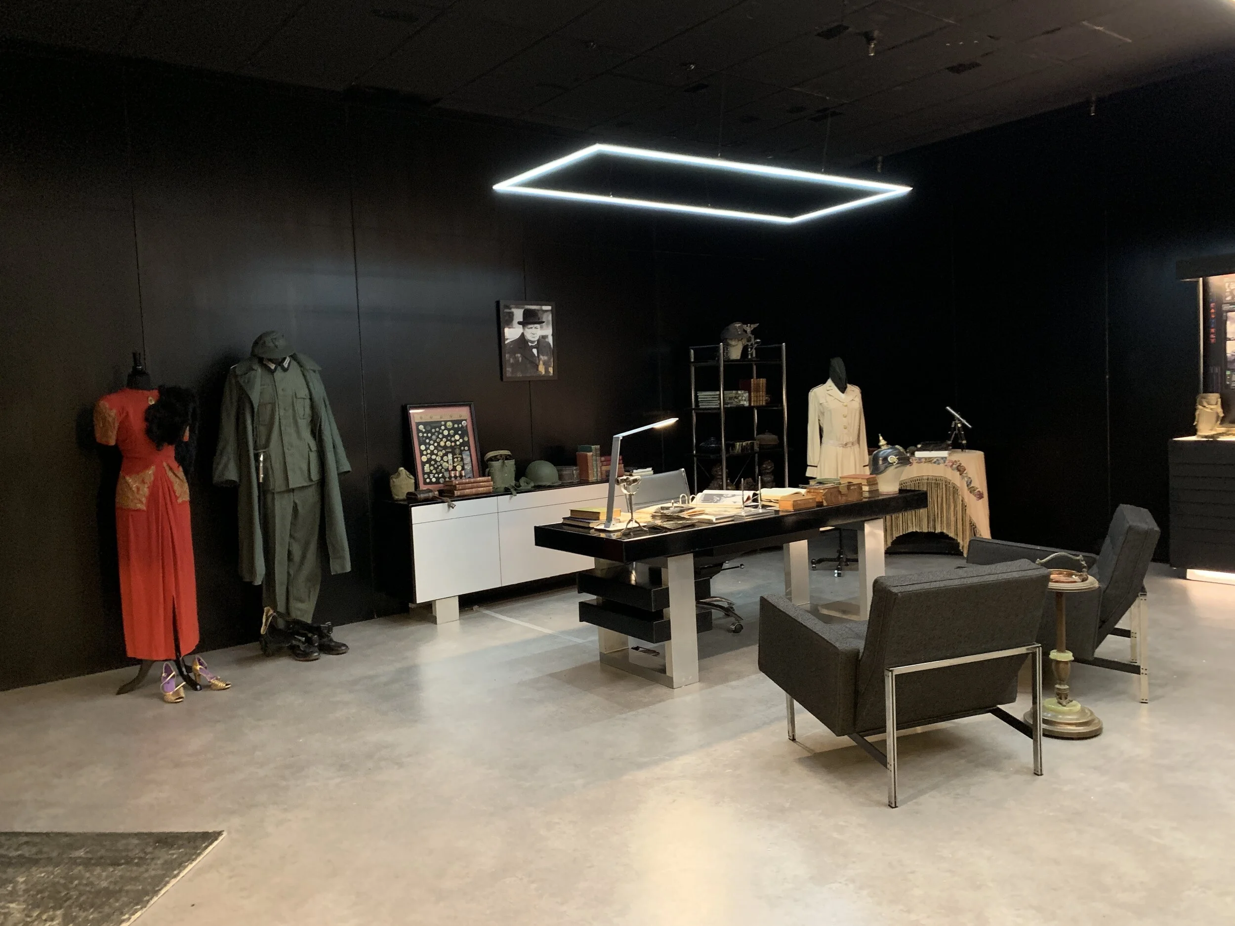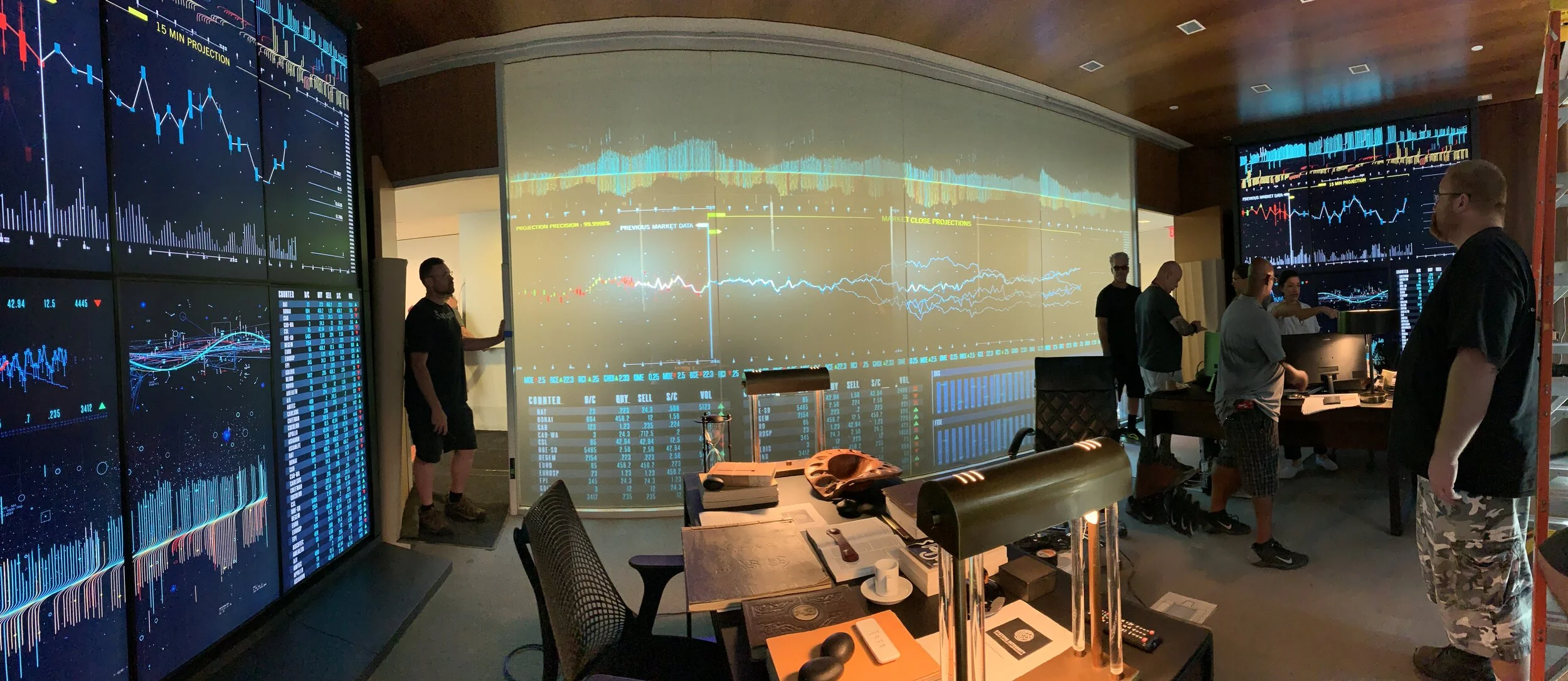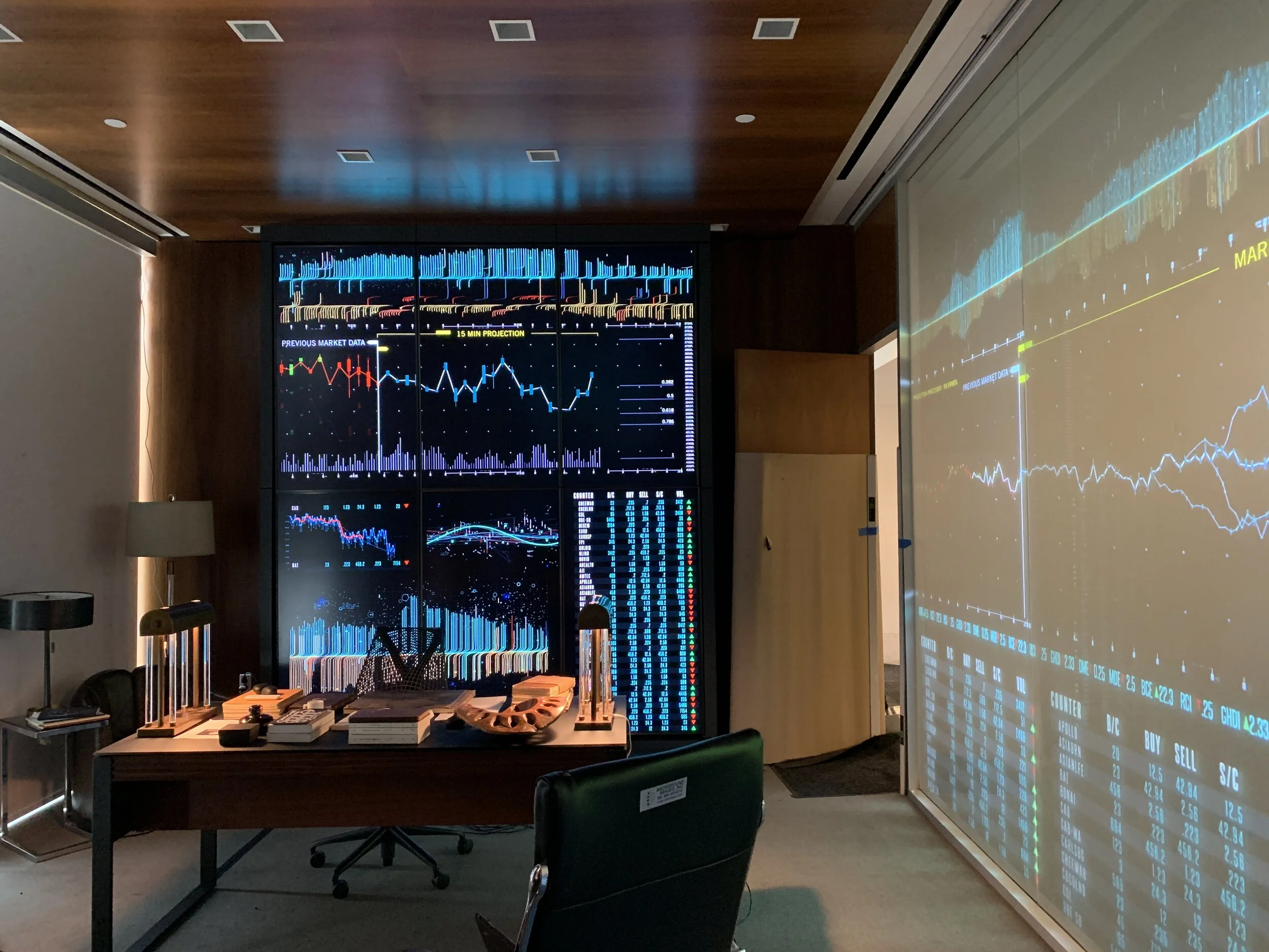 This set had two LED Screen walls, a frosted glass projection wall, and we installed a thin remote-controlled roll down shade for the glass windows.